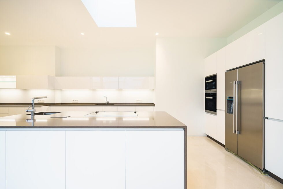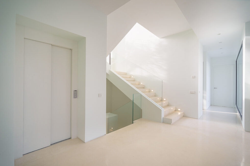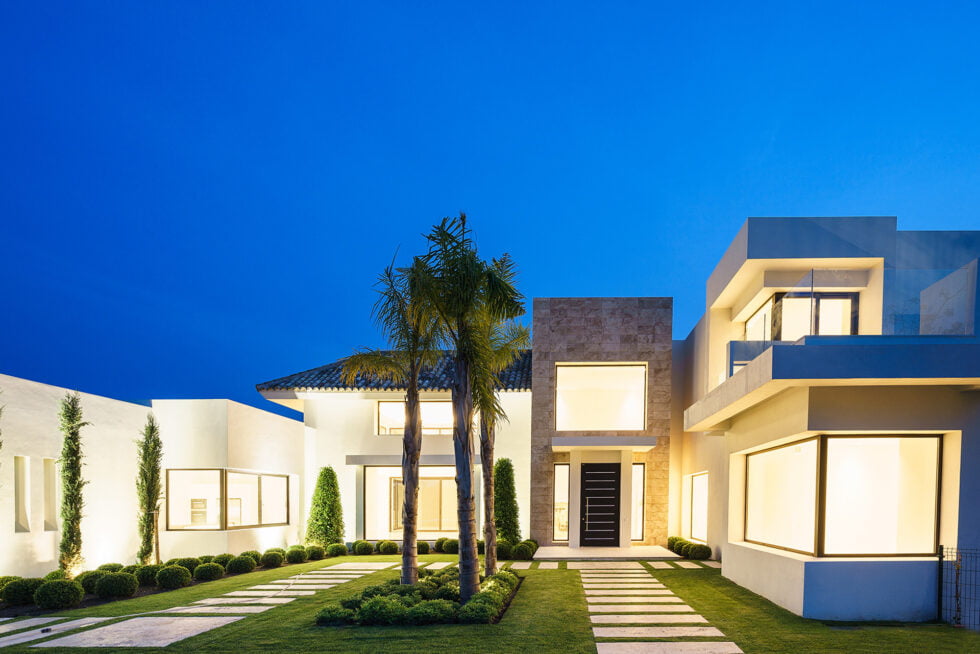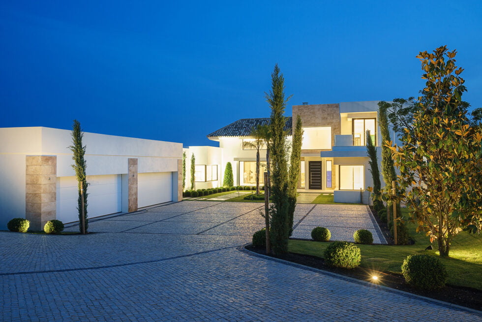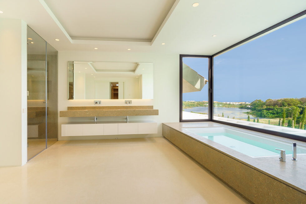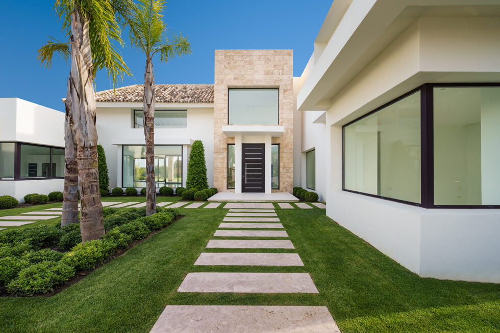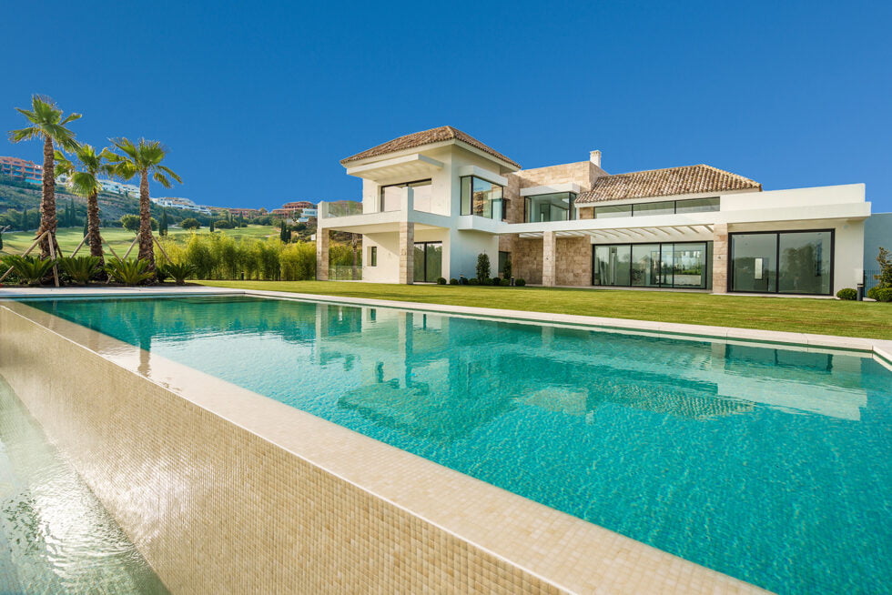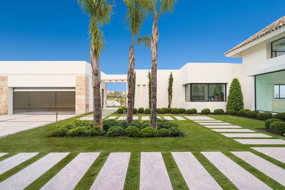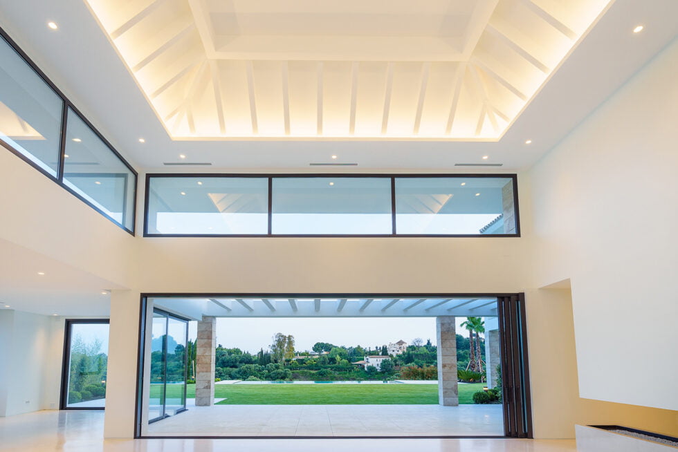 Villa de lujo en construcción en la prestigiosa urbanización de Los Flamingos Golf, en Benahavís, con vistas espectaculares al golf y al mar. La villa tiene una arquitectura moderna, con un bonito patio interior, ofreciendo mucha luz a la vivienda.
