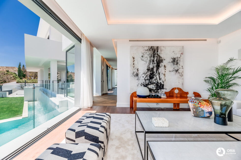 La vivienda, pensada para un uso continuo durante el año, presenta un programa que separa lo público de lo privado; dependencias como salón-comedor-cocina de los cinco dormitorios y baños, quedando en medio zonas de reunión abiertas, que, saliendo de esa intimidad e independencia de los espacios, converge de nuevo hacia la gran vista del mar.